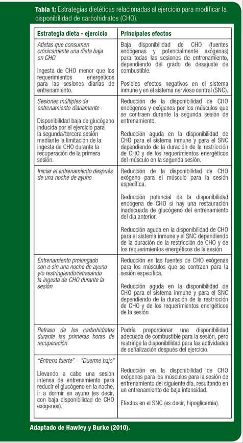 Durante la última década, los avances en biología molecular han permitido a los científicos del ejercicio determinar cómo los programas de entrenamientos basados en resistencia promueven importantes adaptaciones en el músculo esquelético que resultan en la biogénesis mitocondrial y en un aumento concomitante en la capacidad de ejercicio. Como resultado de una mayor comprensión de las bases moleculares de la adaptación al entrenamiento, el interés reciente se ha centrado en cómo la disponibilidad de nutrientes podría modificar la regulación de muchos de los eventos inducidos por la contracción en el músculo en respuesta al ejercicio basado en resistencia (Hawley et al, 2011). Las interacciones nutriente –genes y nutriente –proteína pueden promover o inhibir las actividades de una serie de vías de señalización celular y, por lo tanto, tienen el potencial de modular la adaptación al entrenamiento y la capacidad de rendimiento subsecuente. Hansen et al. (2005) primero tuvo la hipótesis de que el comenzar un ejercicio basado en resistencia con baja disponibilidad de glucógeno promovería una mayor adaptación al entrenamiento en comparación a cuando los mismos entrenamientos se llevaron acabo con reservas de glucógeno muscular normales. Esta noción parece estar en conflicto con la antigua creencia de que los atletas que llevan acabo programas de entrenamiento de ejercicio de resistencia intensos y prolongados deberían consumir una dieta alta en CHO en todo momento. Sin embargo ha habido modificaciones sutiles a las guías de nutrición deportiva en relación la ingesta de CHO en la dieta de los atletas (Burke, 2010). En lugar de promover una ingesta alta de CHO para todos los atletas, las directrices actuales promueven una escala móvil de la ingesta de CHO con el objetivo de hacer coincidir los costos energéticos estimados del entrenamiento y de la recuperación del atleta (Burke 2010; Burke et al., 2011). Esta recomendación se basa en la justificación de que las sesiones de entrenamiento intensas y prolongadas, deben seguir llevándose a cabo con alta disponibilidad de CHO pero que algunas sesiones (de baja intensidad, basadas en habilidades) pueden realizarse con menor aporte de combustibles a partir del glucógeno muscular y de otros combustibles a base de CHO. En realidad, es poco probable que los atletas de resistencia competitivos comiencen cada sesión de entrenamiento con alta disponibilidad de CHO. Sin embargo, el cambiar la recomendación de una alta ingesta de CHO todo el tiempo ha también creado confusión entre algunos entrenadores y atletas. “Entrenar bajo” se ha convertido en un eslogan común tanto en los círculos atléticos como en la literatura científica que se utiliza para describir un tema que incluye una gran cantidad de (diferentes) practicas o como un genérico o una “talla única para todos” promovido como un reemplazo para la era de la “dieta alta en CHO” en el deporte. Hay varias maneras de lograr una baja disponibilidad de CHO antes, durante y después de las sesiones de entrenamiento que difieren en el sitio de bajo estatus de CHO (es decir, el glucógeno endógeno frente al exógeno o la disponibilidad de la glucosa sanguínea), en la duración de la exposición a una intervención dietética en torno al ejercicio, el número de tejidos afectados (es decir, músculo, hígado) así como la frecuencia y el momento de su incorporación al programa de entrenamiento periodizado del atleta (Tabla 1).