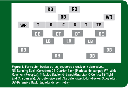 En general, la defensa consiste en una combinación de tres o cuatro linieros defensivos, tres o cuatro apoyadores y cuatro o cinco profundos. En la Figura 1 se muestra una formación ofensiva y una defensiva básicas. En contraste con otros deportes como el basquetbol, hockey y futbol soccer, el futbol americano no es continuo. El juego comprende una serie de jugadas. Si se tiene éxito, definido como la habilidad de ganar al menos 10 yardas en cuatro jugadas, la serie puede continuar. Si no, los equipos cambian de ofensiva a defensiva y de defensiva a ofensiva. El objetivo de los jugadores defensivos es evitar que la ofensiva avance el balón 10 yardas. Mientras más exitosa sea la defensiva alcanzando sus objetivos (es decir, deteniendo a la ofensiva), más rápido saldrán del campo y tendrán mayor potencial para descansar y recuperarse. El objetivo final de la ofensiva es anotar un touchdown (realizar una anotación) o patear un gol de campo. Esto puede suceder en una sola jugada o después de una serie larga de jugadas. En una evaluación de la NCAA (Asociación Nacional de los Estados Unidos que rige las competencias deportivas interuniversitarias) de una temporada de futbol americano de la División III, se encontró un promedio de 14.4 series ofensivas por equipo por juego con un promedio de 4.6 jugadas por serie (Hoffman, 2014). Esto parece ser ligeramente mayor que el número de series promedio reportadas en juegos de la Liga Nacional de Futbol Americano (NFL, por sus siglas en inglés) (Plisk & Gambetta, 1997). Sin embargo, los equipos de la NFL en promedio corren aproximadamente una jugada más por serie que lo visto en los equipos colegiales de futbol americano (entre 5.3-5.6 jugadas por serie). La duración de cada jugada puede variar de 1.9-12.9 segundos con un promedio de duración de jugada de 5.5 segundos en el futbol americano colegial (Kraemer & Gotshalk, 2000). La duración de la jugada en la NFL parece ser ligeramente menor, con un promedio reportado de 5.0 segundos (Plisk & Gambetta, 1997). El tiempo entre jugadas depende del momento en que el árbitro coloque el balón y suene el silbato para que el reloj de jugada inicie. Una vez que suena el silbato, cada equipo tiene un máximo de 25 segundos para iniciar la siguiente jugada. Sin embargo, la estrategia de algunos equipos es colocarse en la línea rápidamente y lanzar el balón (es decir, iniciar la jugada) con un tiempo menor de descanso y buscando cansar al oponente o evitar que haga sustituciones por jugadores descansados. Por lo tanto, el intervalo de descanso entre cada jugada puede variar de algunos segundos a un máximo de 25 segundos de duración. En algunos reportes, el promedio de tiempo entre jugadas en un juego de futbol americano colegial es de 32.7 segundos (Kraemer & Gotshalk, 2000), mientras que el intervalo promedio de descanso entre jugadas en la NFL ha sido reportado entre 26.9-36.4 segundos (Plisk & Gambetta, 1997). Sin embargo, estos estudios son de hace 15–17 años y con los cambios en la estrategia de juego, estos tiempos podrían ser considerados como una aproximación. La capacidad de determinar el tiempo promedio por jugada y de descanso entre jugadas permite una comprensión más precisa de las demandas fisiológicas del juego. De la misma forma aporta información importante para el desarrollo de la prescripción del ejercicio anaeróbico.